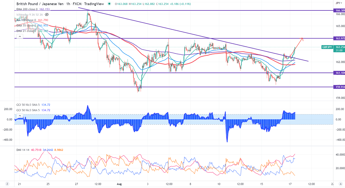 GBPJPY gained sharply after hitting a low of 160.08. It has shown a minor decline despite upbeat UK CPI. The annual inflation surged to a 40-year high of 10.1%, above a forecast of 9.4%. Any breach above 1.2150 confirms further bullishness. Technically in the hourly chart, the pair is holding above short-term 21-EMA, 55 EMA, and long-term 200 EMA (162.13). Any violation past 163 takes to the next level 164. Any breach above 164 confirms a minor bullish trend. A jump to 165/166.30 is possible.GBPJPY hits an intraday high of 163.04 and is currently trading around 162.99.