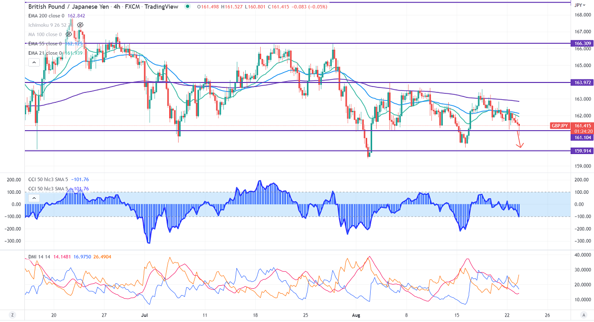 GBPJPY continues to trade weak for the past four days and lost more than 300 pips on the weak pound sterling. It has broken significant support at 1.17500 and trades below that level on board-based US dollar. Markets eye UK PMI data for further direction. Technically in the 4-hour chart, the pair is holding below short-term 21-EMA, 55 EMA, and below long-term 200 EMA (162.84). Any violation below 160.80 takes to the next level 160//159/158.GBPJPY hits an intraday low of 160.80 and is currently trading around 161.32.