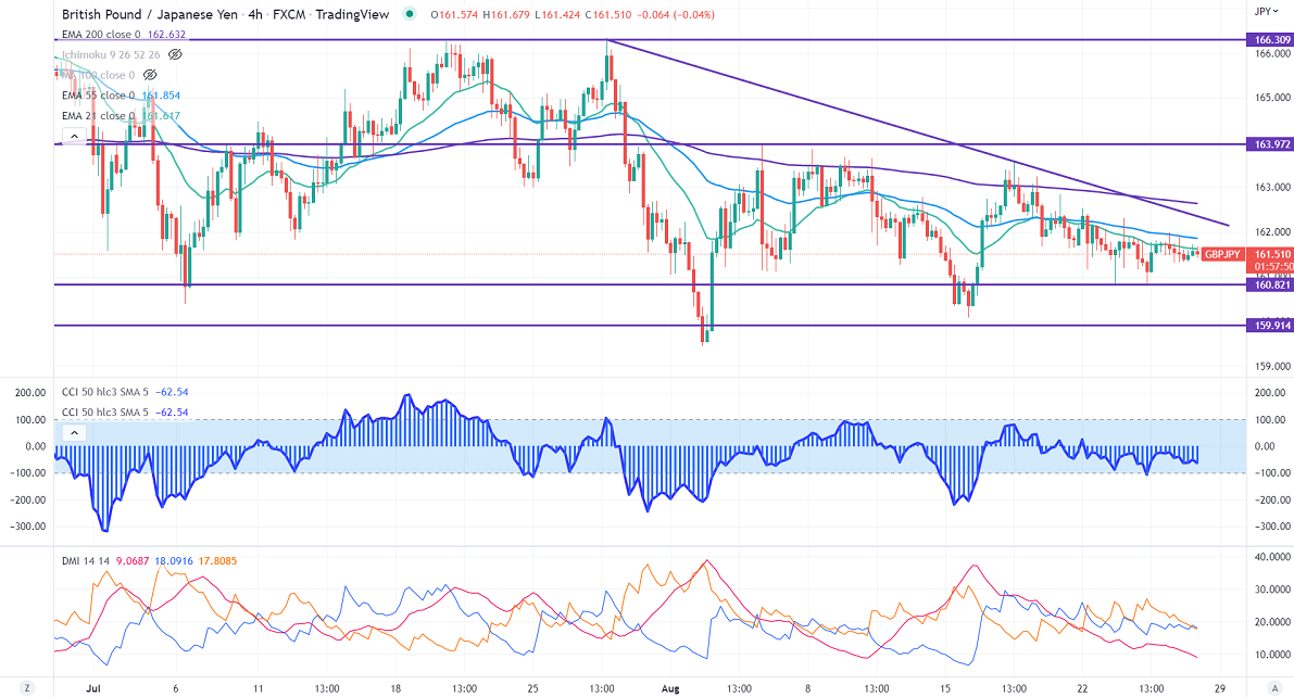 GBPJPY is trading flat between 162.31 and 160.83 for the past three days. The pound sterling recovered above 1.1800 ahead of the Fed chairman's speech at the Jackson hole symposium. The pound sterling upside is capped as rising energy prices due to Russia and Ukraine war will affect the growth of the UK. Technically in the 4-hour chart, the pair is holding below short-term 21-EMA, 55 EMA, and below long-term 200 EMA (162.78). Any violation below 160.80 takes to the next level 160/159/158.GBPJPY hits an intraday high of 161.718 and is currently trading around 161.49.