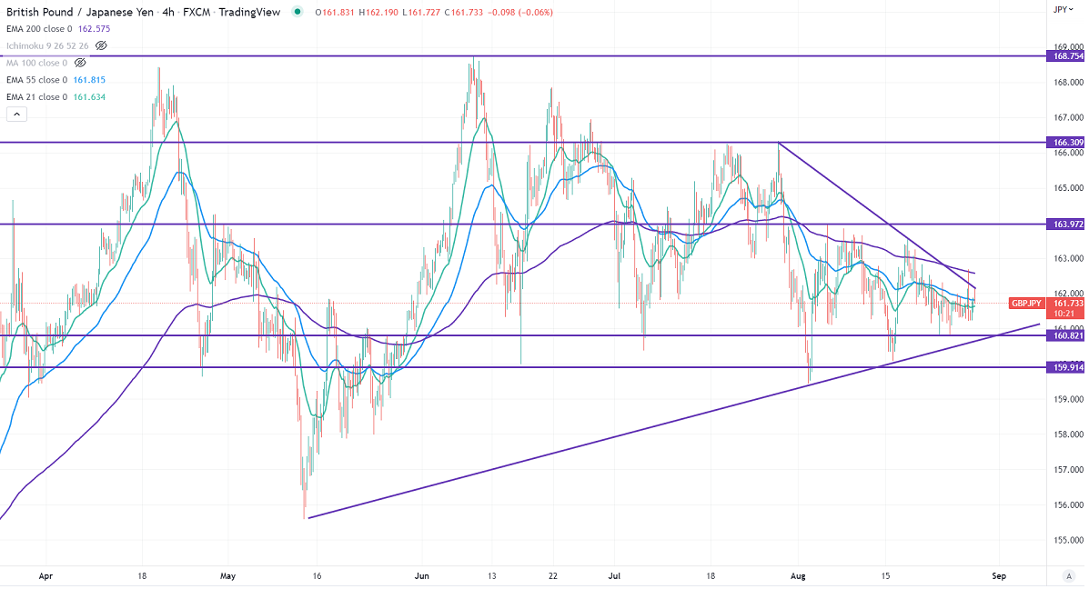 GBPJPY trades flat despite weak pound sterling. It has lost its shine against the dollar and hit the lowest level since Mar 2020 on UK recession fears due to a surge in energy costs. US Fed chairman Powell's hawkish speech in Jackson hole also puts pressure on the cable. Technically in the 4-hour chart, the pair is holding above short-term 21-EMA, 55 EMA, and below long-term 200 EMA (162.58). Any violation below 161.45 takes to the next level 160.80/159/158. GBPJPY hits an intraday high of 162.18 and is currently trading around 161.89.