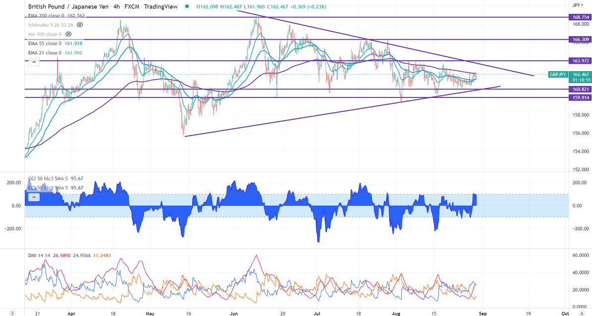 GBPJPY showed a minor jump above 162 levels on short covering in pound sterling. It was one of the worst performers against the US dollar as surging energy costs will hurt the UK economy. The yen performed well after upbeat Japanese employment data. Technically in the 4-hour chart, the pair is holding above short-term 21-EMA, 55 EMA, and below long-term 200 EMA (162.58). Any violation below 161.80 takes to the next level 160.80/159/158. GBPJPY hits an intraday high of 162.55 and is currently trading around 162.30.