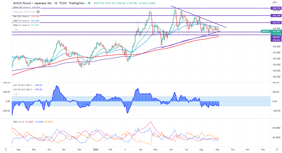 GBPJPY pared most of its gains on the weak pound sterling. It hits two years low against the US dollar on board-based dollar buying. Markets eye the UK election result for further direction. The surge in European gas price as Russia keeps the NordStream link shut increases the chance of a recession in the U.K. Technically in the daily chart, the pair is holding below above short-term 21-EMA, 55 EMA, and above long-term 200 EMA (159.78). Any daily below 159.75takes to the next level 159/158. GBPJPY hits an intraday low of 160.66 and is currently trading around 161.06.
