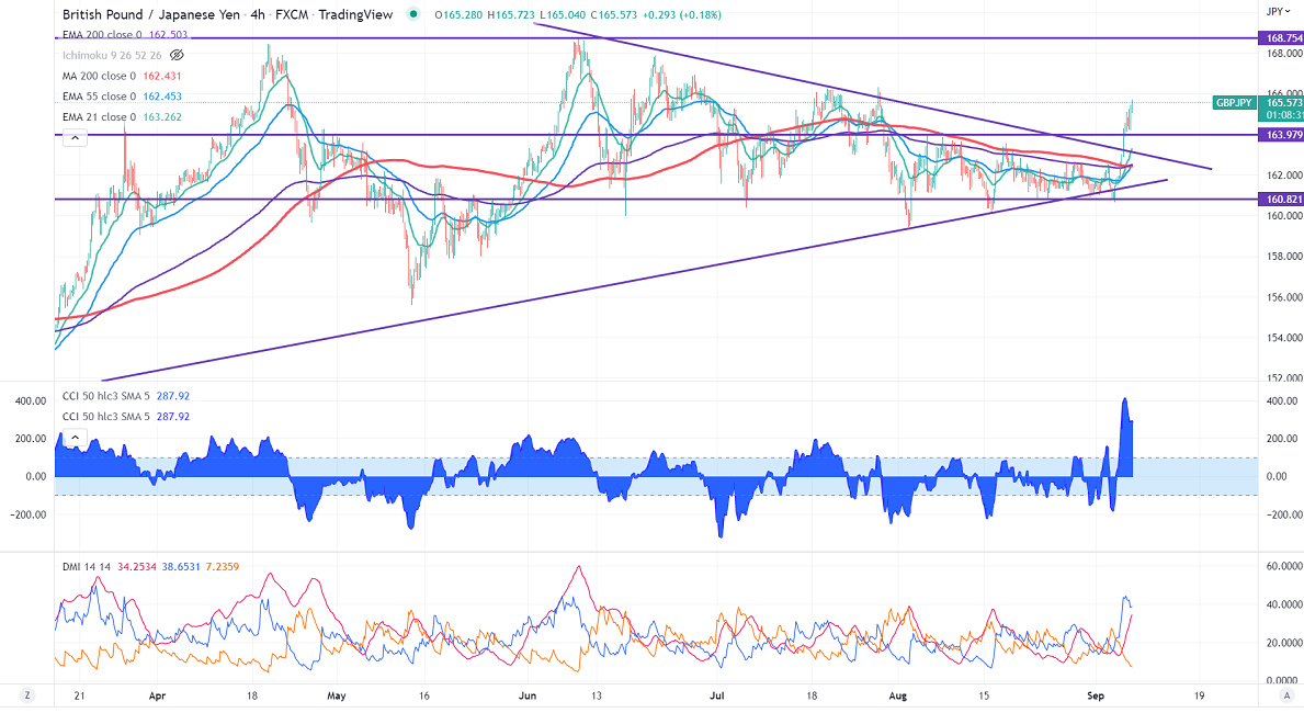 GBPJPY surged drastically and hits a 4-week high on a weak yen. The pound sterling trades weak against the US dollar on board based US dollar buying energy crisis in the UK. Cable enjoyed a minor pullback after the election of a New UK PM. Technically in the 4- hour chart, the pair is holding above short-term 21-EMA, 55 EMA, and long-term 200 EMA (162.50). Any surge above 166.25 will take the pair to the next level 167/167.80/168. GBPJPY hits an intraday high of 165.72 and is currently trading around 165.549.