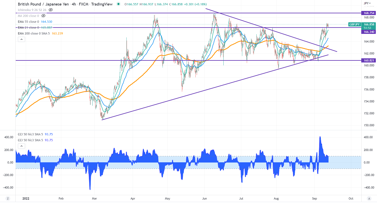 GBPJPY consolidating in a narrow range after a massive jump over the past two days. The pound sterling gained above 1.1700 against the USD on upbeat UK jobs data. The unemployment rate dropped to 3.6% from 3.8%. The UK's headline Claimant count change increased in August to 6.3K compared to a forecast of -9.2K. Technically in the 4-hour chart, holding above short-term 21-EMA, 55 EMA, and long-term 200 EMA (163.23). Any surge above 167.10 will take the pair to the next level 167.80/168.70. GBPJPY hits an intraday high of 166.98 and is currently trading around 166.891.