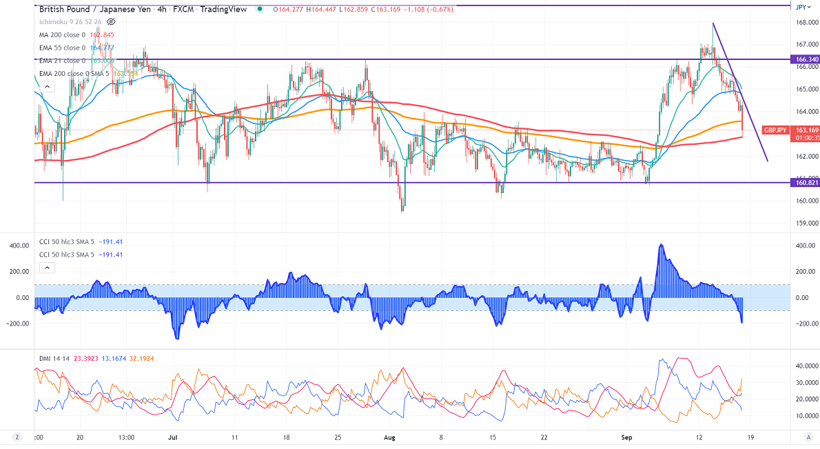 GBPJPY tumbled sharply after dismal UK retail sales. It fell by -1.6% in Aug the sharpest pace in eight months compared to an estimate of -0.50%. GBPUSD extended loss and hits fresh week low. Technically 4-hour chart, holds below short-term 21-EMA, above 55 EMA, and long-term 200 EMA (163.49). Any decline below 163.50 will take the pair to the next level 163/162. GBPJPY hits an intraday high of 164.50 and is currently trading around 163.14.