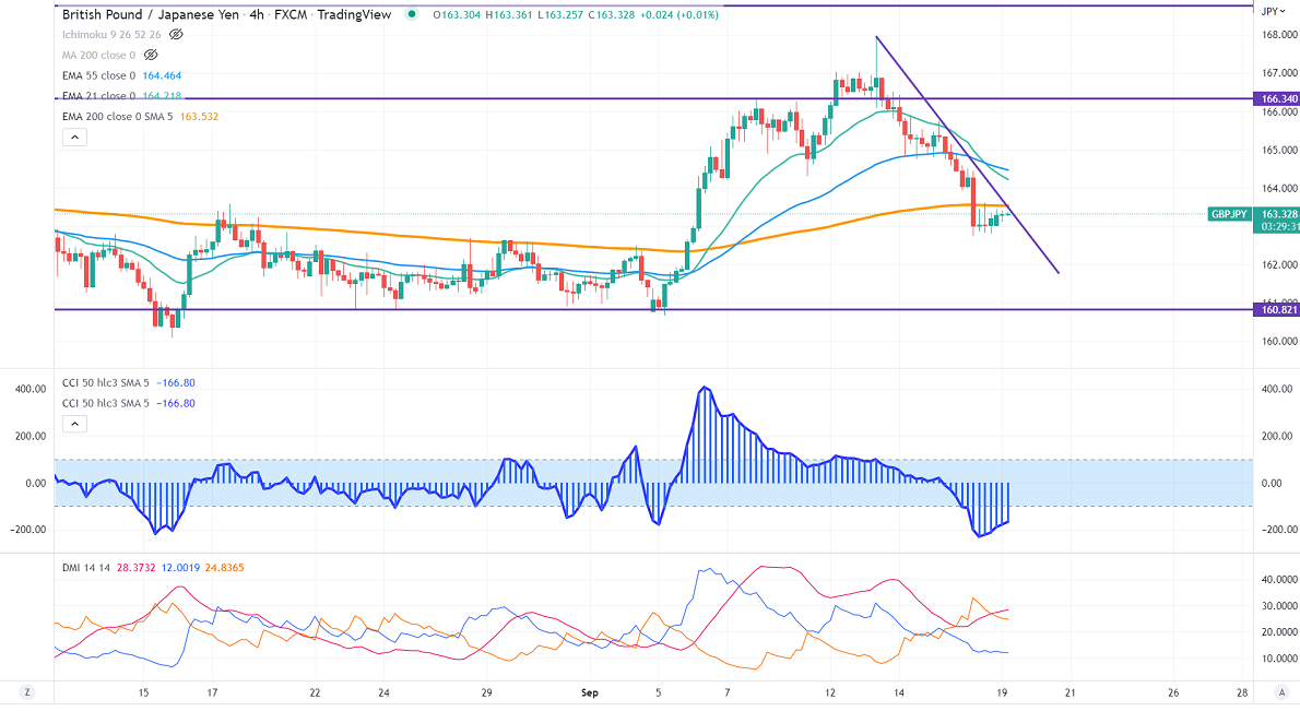GBPJPY consolidates in a narrow range after a massive sell-off. The pound sterling hits a fresh two-year low against the US dollar in expectations of another 75 bpbs hike by the Fed in Sep 21st policy meeting. Technically 4-hour chart, holds below short-term 21-EMA, above 55 EMA, and long-term 200 EMA (163.53). Any decline below 162.70 will take the pair to the next level 162/160.80/159. GBPJPY hits an intraday high of 163.405 and is currently trading around 163.332.