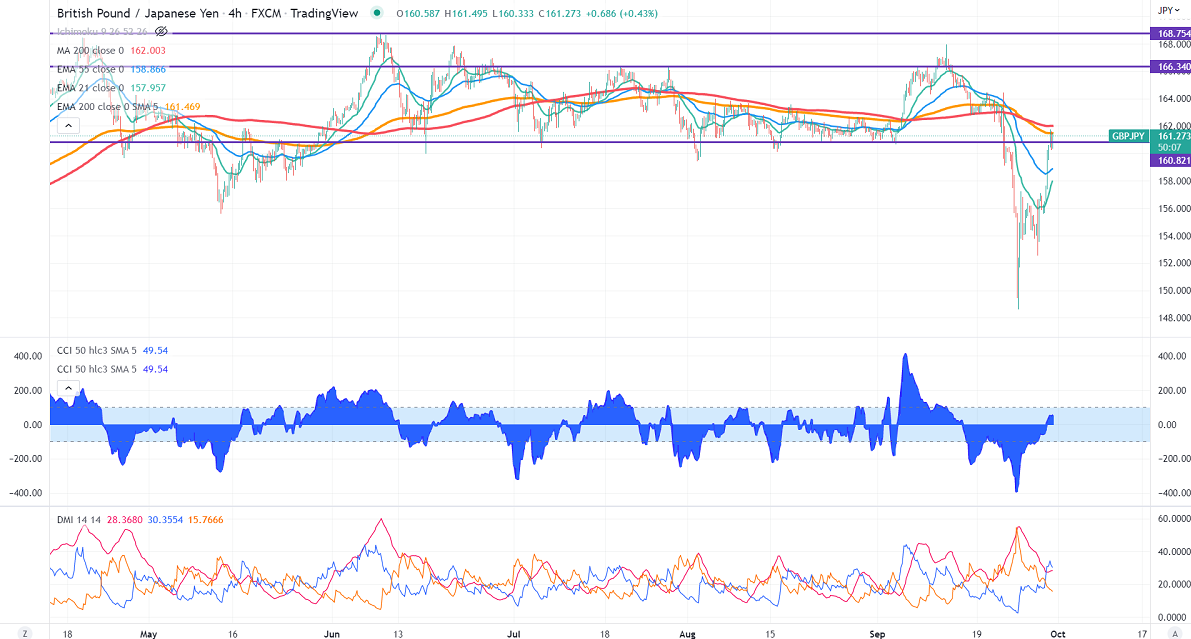 GBPJPY recovered more than 1300 pips from a low of 148.63 on the strong Pound sterling. It surged sharply against the US dollar on board-based dollar selling. UK GDP grew to 0.2% QoQ compared to a forecast of -0.10%. The yearly figures came at 4.4%, well above the estimate of 2.90%. Technically in the 4-hour chart, holds above short-term 21-EMA, 21 EMA, and below long-term 200 EMA (161.95). Any convincing break above 162.20 will take the pair to the next level 163.45/164. GBPJPY hits an intraday high of 161.74 and is currently trading around 160.96.