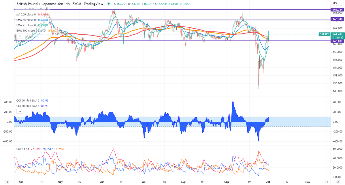 GBPJPY holds above 162 on the strong pound sterling. It gained sharply against the US dollar after the UK govt reversed the abolition of the 45p tax rate on incomes over £150000. Bank of England bought 1.195 billion pounds of bonds to calm down the market and support the pound at lower levels. The overall trend of GBPUSD is weak as the energy crisis deepens increasing the chances of recession. Technically in the 4-hour chart, holds above short-term 21-EMA, 21 EMA, and below long-term 200 EMA (161.99). Any convincing break above 163 will take the pair to the next level 163.45/164/165. GBPJPY hits an intraday high of 163.30 and is currently trading around 162.495.