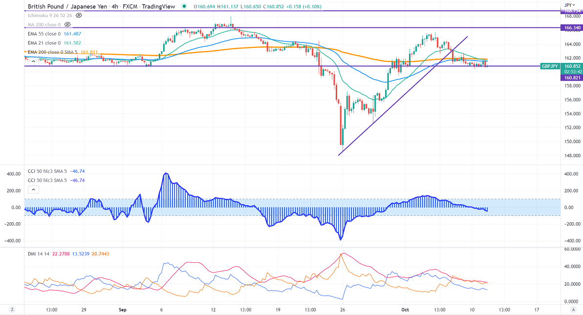 GBPJPY trades flat ahead of UK employment data. The pound sterling lost its shine despite the BOE emergency bond-buying program. The demand for the USD increased due to the escalation of tension between Russia and Ukraine. Markets eye UK claimant count change and BOE Bailey's speech for further direction. Any breach below 1.1000 confirms further bearishness Technically in the 4-hour chart, GBPJPY holds below short-term 21-EMA,551 EMA, and long-term 200 EMA (161.87). Any convincing break below 160 will take the pair to the next level 159/158. GBPJPY hits an intraday high of 161.13 and is currently trading around 160.99.
