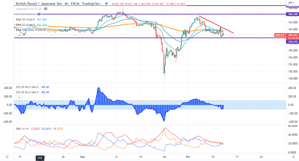 GBPJPY trades weak after dismal UK data. The economy shrank by 0.30% in August from Jul due to weakness in the manufacturing sector. The pound sterling pared some of its gains despite the extension of bond buying. The geopolitical tension between Russia and Ukraine also puts pressure on cable at higher levels. . Any breach below 1.0900 confirms further bearishness. Technically in the 4-hour chart, GBPJPY holds below short-term 21-EMA,55- EMA, and long-term 200 EMA (161.78). Any convincing break below 159 will take the pair to the next level 158/155.60. GBPJPY hits an intraday high of 161.50 and is currently trading around 160.48.