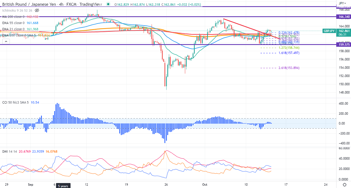 GBPJPY pared some of its gains yesterday on the weak Pound sterling. It lost its shine after Kwarteng said that the Bank of England will be to blame if UK markets slide next week. Markets eye US CPI data for further direction. The geopolitical tension between Russia and Ukraine also puts pressure on cable at higher levels. Any breach above 1.11850 confirms further bullishness. Technically in the 4-hour chart, GBPJPY holds above short-term 21-EMA, 55- EMA, and long-term 200 EMA (161.814). Any convincing break below 162.30 will take the pair to the next level 161.65/161/160. GBPJPY hits an intraday low of 162.31 and is currently trading around 162.77.
