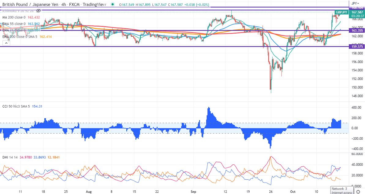 GBPJPY recovered sharply on the weak yen. The jump in Pound sterling in hopes for a decent fiscal framework from new chancellor Hunt. Bank of England Bailey's hawkish comments also support the pair at lower levels. Any breach above 1.113800 will push GBPUSD to 1.14900. Technically in the 4-hour chart, GBPJPY holds above short-term 21-EMA, 55- EMA, and long-term 200 EMA (162.36). Any convincing break above 168 will take the pair to the next level 168.75/170. GBPJPY hits an intraday high of 168.03 and is currently trading around 167.709.