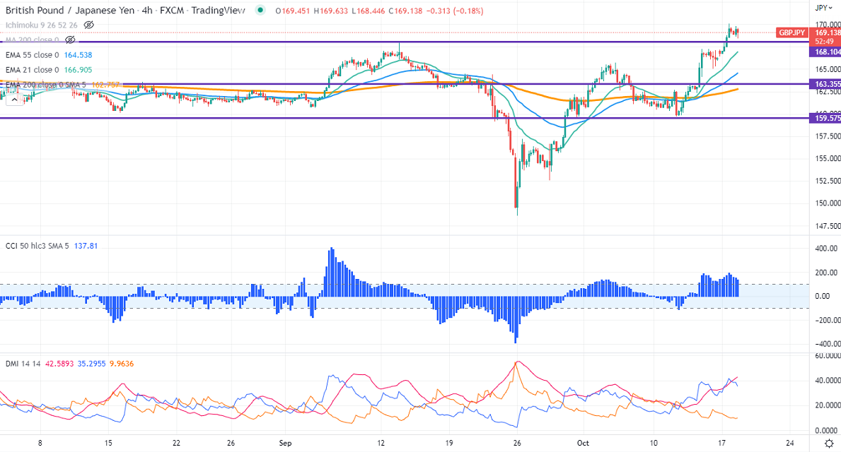 GBPJPY was one of the best performers in the past 10 days on the strong Pound sterling. GBP gained against all majors after UK chancellor Hunt scarped all tax cuts introduced by the new government. Bank of England also expected to delay quantitative tightening. Any breach below 1.1300 will drag GBPUSD to 1.1190. Technically in the 4-hour chart, GBPJPY holds above short-term 21-EMA, 55- EMA, and long-term 200 EMA (162.36). Any convincing break above 170 will take the pair to the next level 172/175. GBPJPY hits an intraday low of 168.44 and is currently trading around 167.709.
