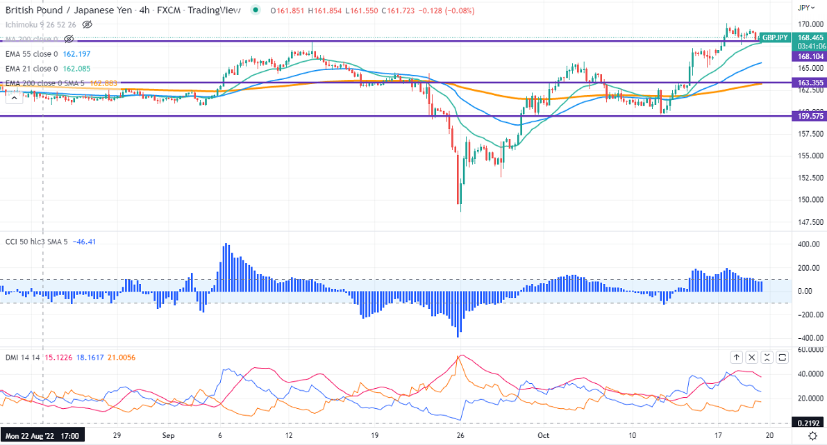 GBPJPY pared some of its gains on a minor sell-off in the pound sterling. It declined sharply despite strong UK inflation. The annualized CPI soared to 10.10% in Sep vs the forecast of 10%. Monthly CPI came at 0.5% in Sep vs 0.4 expected. Any breach below 1.1180 will drag GBPUSD to 1.0900. Technically in the 4-hour chart, GBPJPY holds above short-term 21-EMA, 55- EMA, and long-term 200 EMA (163.15). Any convincing break above 170 will take the pair to the next level 172/175. GBPJPY hits an intraday low of 168.44 and is currently trading around 167.709.