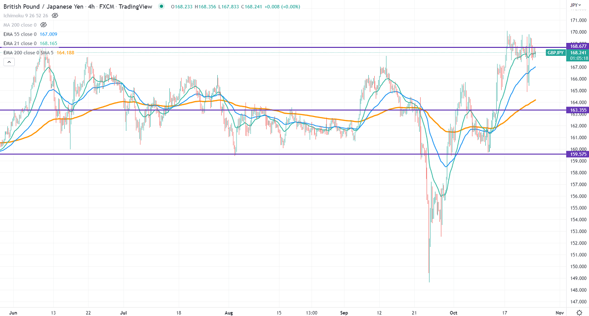 GBPJPY recovered sharply after hitting a minor bottom of 164.86. The pound sterling surged against all majors on optimism about political development in the UK. The market mood got elevated in the UK after the election of New PM Rishi Sunak will bring stability to the UK economy. Any close above 1.13255 confirms intraday bullishness, a jump to 1.1400 is possible. Technically in the 4-hour chart, GBPJPY holds above short-term 21-EMA, 55- EMA, and long-term 200 EMA (164.14). Any convincing break above 170 will take the pair to the next level 172/175. GBPJPY hits an intraday low of 169.32 and is currently trading around 168.896.