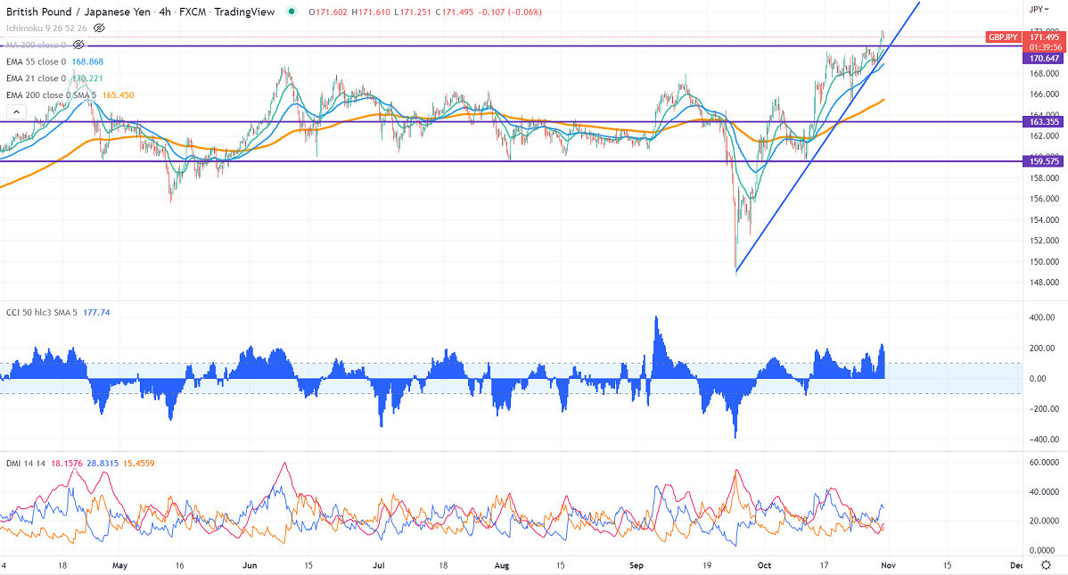 GBPJPY dropped slightly after a massive jump the previous week. The jump in pound sterling due to UK political stability and hawkish BOE. The yen lost more than 300 pips against the USD on policy divergence between US Fed and BOJ. Any surge above 1.6600 will take GBPUSD to next level 1.17250. Technically in the 4-hour chart, GBPJPY holds above short-term 21-EMA, 55- EMA, and long-term 200 EMA (165.38). Any convincing close above 172 will take the pair to the next level 173.15/175. GBPJPY hits an intraday low of 171.25 and is currently trading around 171.45.