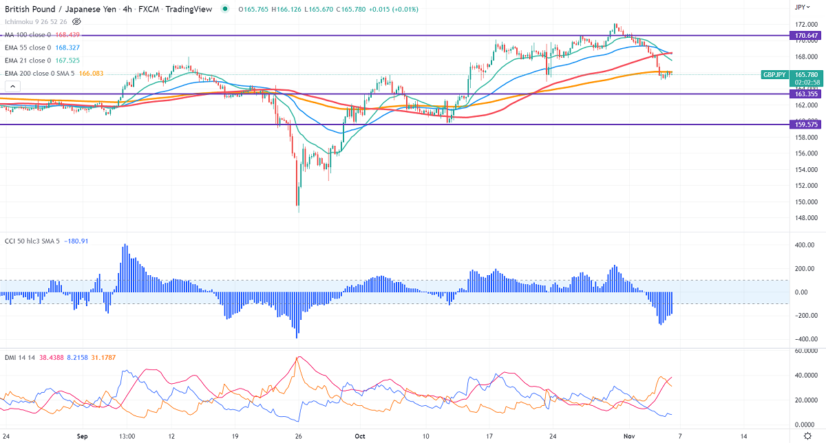 GBPJPY was one of the worst performers this week and lost more than 600 pips on the weak Pound sterling. It has pared most of its gains against the US dollar after the Bank of England kept its rates on hold. The policy divergence between Fed and BOE puts pressure on the pair at higher levels. A violation below 1.1150 confirms further bearishness, a dip to 1.100 is possible. Technically in the 4-hour chart, GBPJPY holds below short-term 21-EMA, 55- EMA, and long-term 200 EMA (166.08). Any convincing close below 165 will drag the pair to the next level 163.90/. GBPJPY hits an intraday low of 165.14 and is currently trading around 165.77.