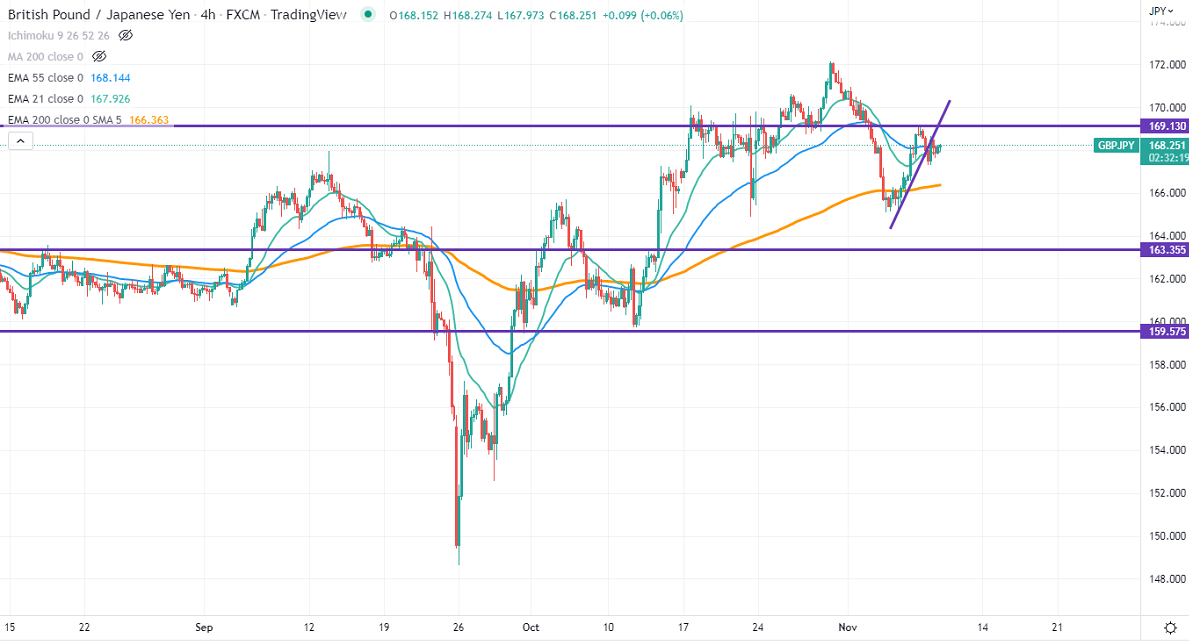 GBPJPY trades in a narrow range between 169.09 and 167.29 for the past two trading days. The British Pound surged sharply yesterday on upbeat global cues. The chance of an aggressive rate hike by the Fed diminished after weak US economic data. Markets eye US CPI, Midterm elections, and UK fiscal plans for further direction. Any violation above 1.1650 confirms further bullishness; a jump to 1.1800 is possible. Technically in the 4-hour chart, GBPJPY holds above short-term 21-EMA, 55- EMA, and above long-term 200 EMA (166.36). Any convincing close below 168 will drag the pair to the next level 166.60/165. GBPJPY hits an intraday low of 168.22 and is currently trading around 168.18.