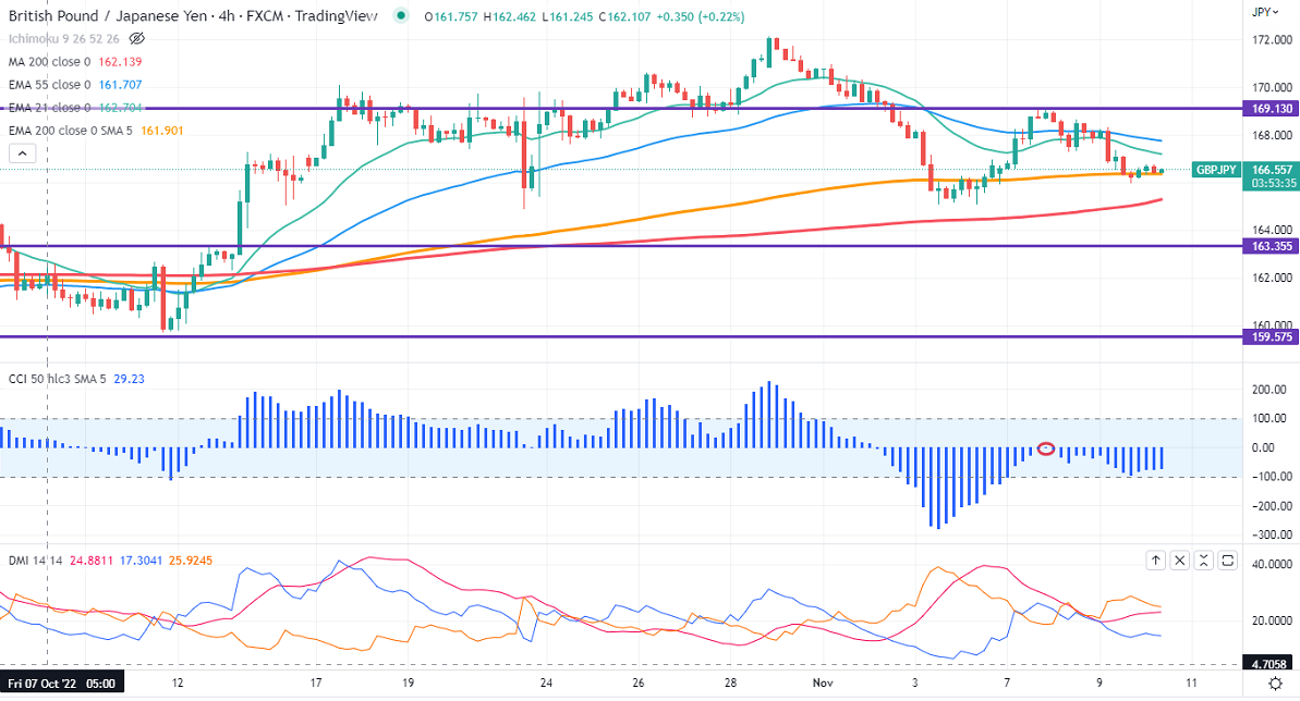 GBPJPY pared most of its gains made on Monday. The pound sterling declined sharply ahead of the first estimate of the UK GDP data. Bank of England hiked rates by 75 bpbs the previous Thursday with a dovish stance. The central has warned of a recession at end of this year and planning to go for smaller rate hikes in near future despite high inflation. Any violation below 1.1300 confirms further bearishness; a dip to 1.1500 is possible. Technically in the 4-hour chart, GBPJPY holds above short-term 21-EMA, 55- EMA, and above long-term 200 EMA (166.36). Any convincing close below 165 will drag the pair to the next level 163.80/163. GBPJPY hits an intraday low of 168.42 and is currently trading around 166.47.