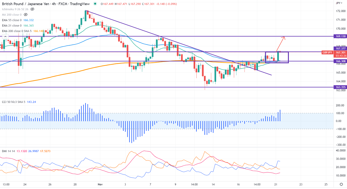 GBPJPY pared some of its gains on the weak Pound sterling. It has halted its two weeks of bullish trend against the US dollar and lost more than 150 pips. Investors started preferring safe assets like the US dollar after China reported 2 new deaths due to COVID. Any close below 1.1800 confirms further bearishness; a dip to 1.1700 is possible. Technically in the 4-hour chart, GBPJPY holds above 21-EMA, 55- EMA, and long-term 200 EMA (166.11). Any convincing close above 167.40 will take it to the next level 168.50/169/170. GBPJPY hits an intraday high of 166.94 and is currently trading around 166.806.