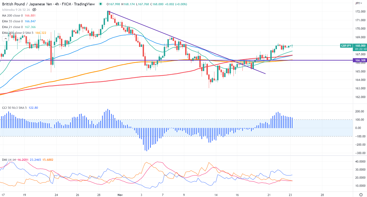 GBPJPY trades flat after a minor pullback. The intraday trend remains bullish as long as support 167.30 holds. Markets eye UK PMI data for further direction. According to the OECD forecast, the UK economy would decline by 0.4% in 2023 and rise by 0.2% in 2024. Any close above 1.19500 confirms further bullishness, a jump to 1.2035 is possible. Technically in the 4-hour chart, GBPJPY holds above 21-EMA, 55- EMA, and long-term 200 EMA (166.20). Any convincing close above 168.65 will take it to the next level 169/170. GBPJPY hits an intraday low of 167.50 and is currently trading around 167.573