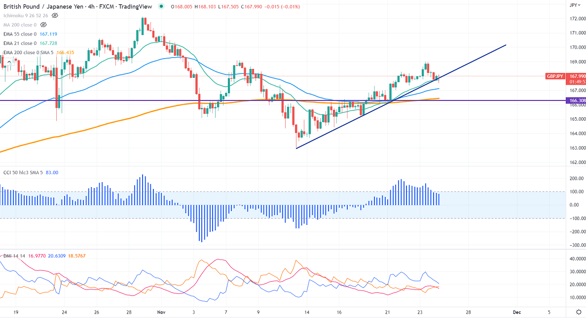 GBPJPY pared some of its gains after hitting one week high on the strong yen. It gained strongly against the USD after dovish Fed minutes. The FOMC minutes indicate that a "substantial majority of participants judged that a slowing in the pace of increase would likely soon be appropriate,". The minor pullback in pound sterling prevents the pair from further downside Any close above 1.2100 confirms further bullishness, and a jump to 1.2180 is possible. Technically in the 4-hour chart, GBPJPY holds above 21-EMA, 55- EMA, and long-term 200 EMA (166.40). Any convincing close above 169.10 will take it to the next level 170/172. GBPJPY hits an intraday low of 167.50 and is currently trading around 168.02