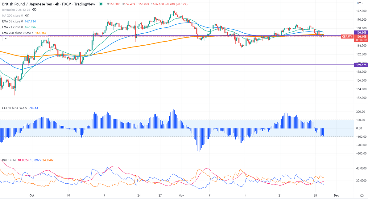 GBPJPY hits a six-day low on Pound sterling weakness. It hits an intraday high of 166.61 and is currently trading around 166.29.