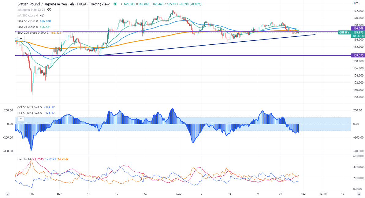 GBPJPY is trading weak for the third consecutive day on board-based yen strength. It hits an intraday low of 165.45 and is currently trading around 165.67.