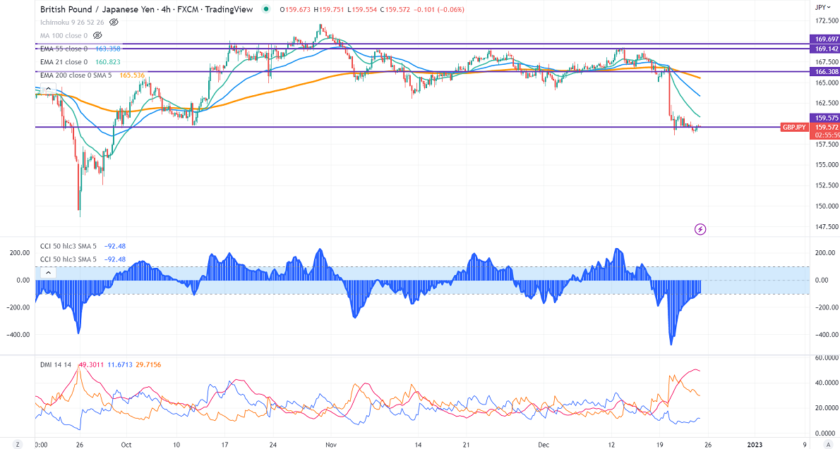 GBPJPY trades weak on the weak Pound sterling. It hits a low of 158.79 yesterday and is currently trading around 159.69.