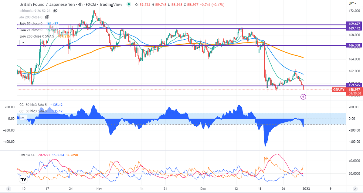 GBPJPY trades below 160 levels on the strong yen. It hits an intraday low of 160.72 and is currently trading around 158.85.