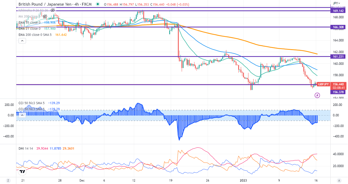 GBPJPY declined sharply and faced strong resistance at 161.25 (21- day EMA) on the strong yen. It hits a low of 155.63 and is currently trading around 156.57.