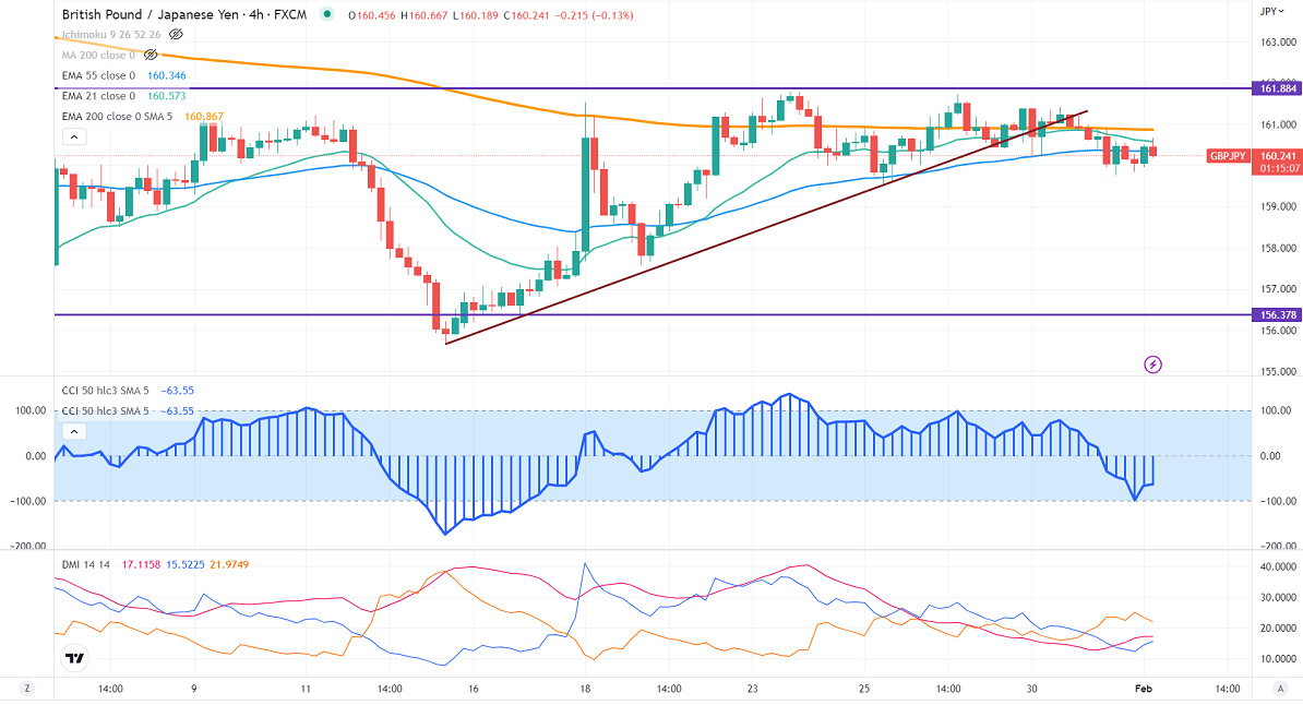 GBPJPY trades sideways ahead of Fed monetary policy. It hits a low of 159.75 and is currently trading around 160.305.