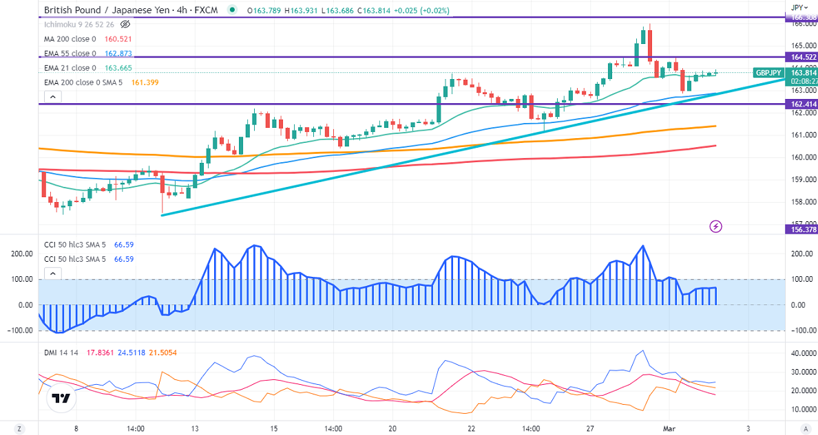 GBPJPY showed a minor pullback of 100 pips on the weak yen. It hits a high of 163.93 at the time of writing and is currently trading around 163.75.