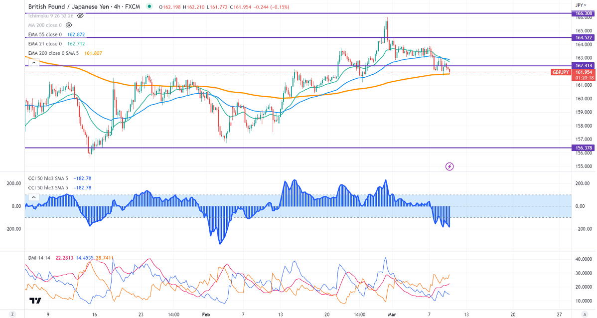 GBPJPY trading weak for the past three consecutive days on the weak pound sterling. It hits an intraday high of 161.95 and is currently trading around 161.99.
