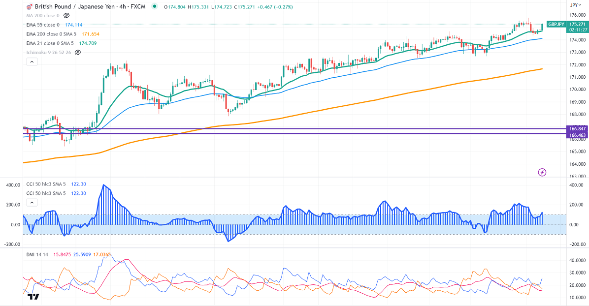 GBPJPY trading in a narrow range between 175.76 and 174.34 for the past three days. It hits an intraday high of 175.31 and is currently trading around 175.525.