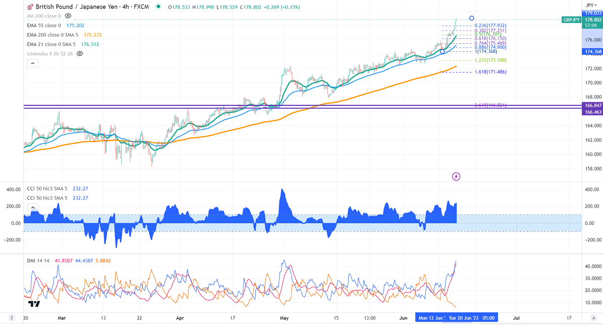 GBPJPY has continued to trade higher for the past six months on a weak yen. It hits an intraday high of 178.99 and is currently trading around 178.82.