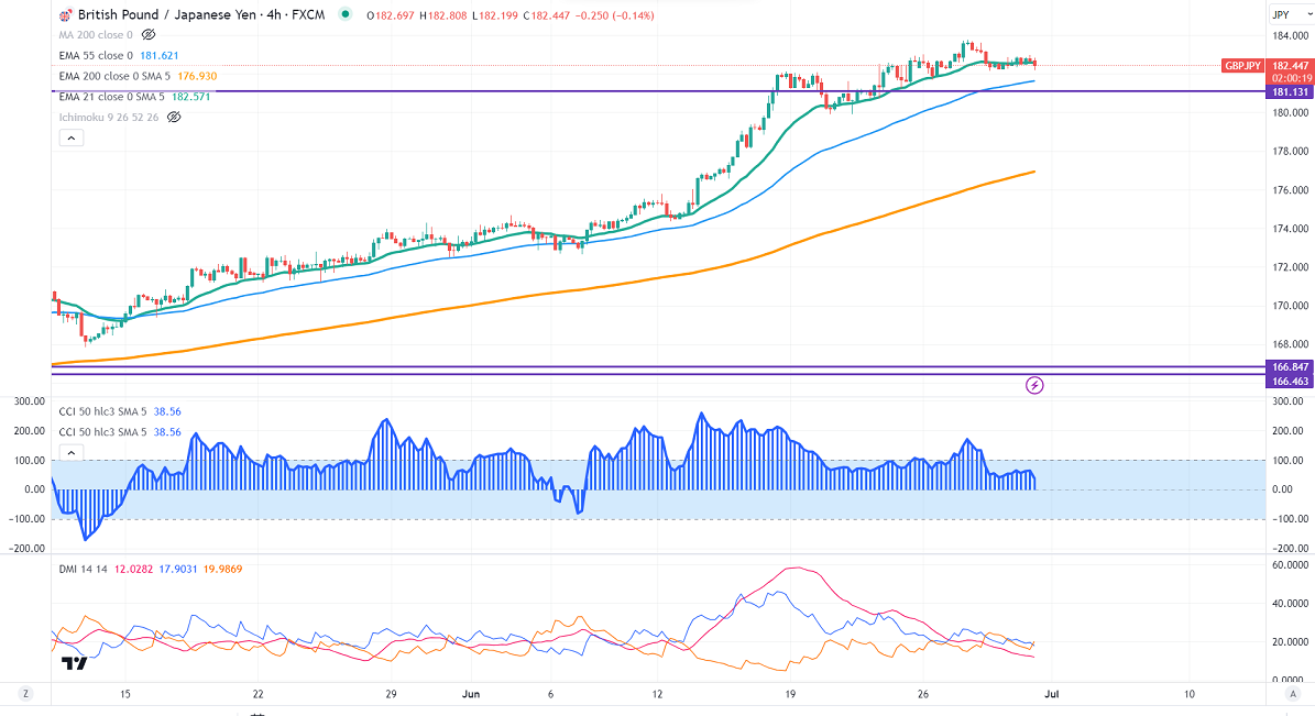 GBPJPY showed a minor sell-off on Pound sterling weakness. It hits an intraday low of 182.19 and is currently trading around 182.33.