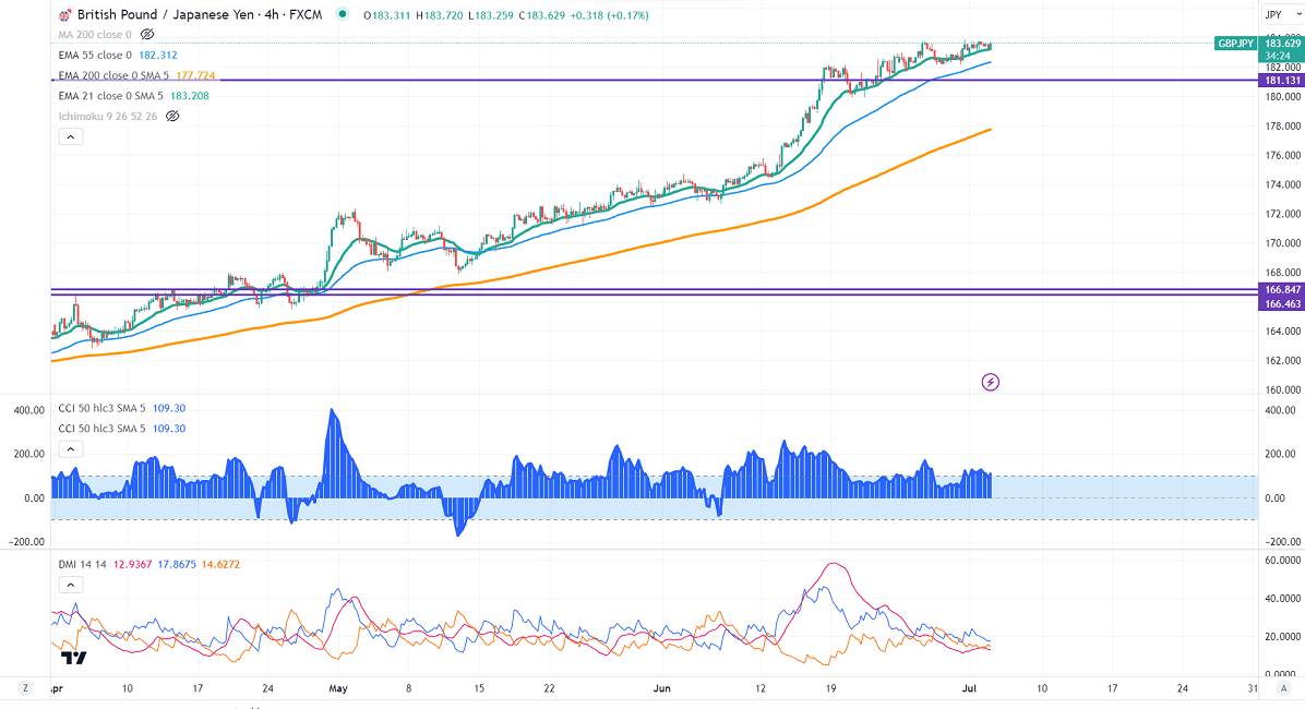 GBPJPY is trading flat between 183.874 and 182.92 for the past three days. It hits a low of 183.23 and is currently trading around 183.67.