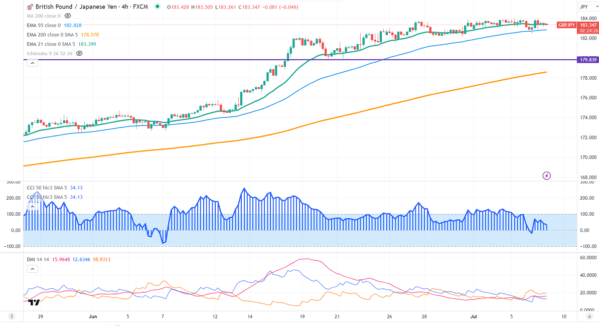 GBPJPY showed a minor pullback on the strong Pound sterling. It hits a high of 184 and is currently trading around 183.23.