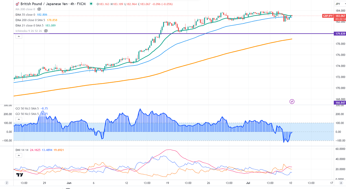 GBPJPY is consolidating in a narrow range between 184.01 and 182 for the past three days. It hits an intraday high of 183.21 and is currently trading around 183.05.