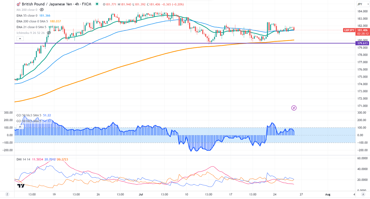 GBPJPY consolidating in a narrow range between 182.52 and 179.73 for the past three days. It hits a high of 182.01 yesterday and is currently trading around 181.74.