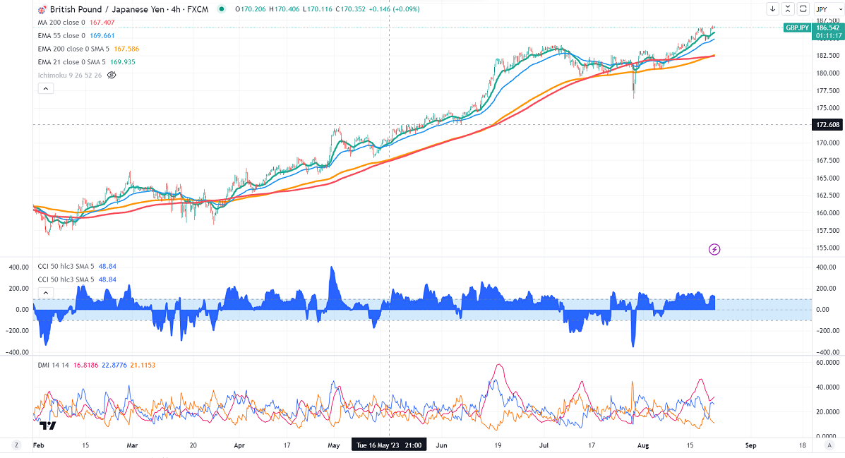 GBPJPY showed a minor pullback on the strong Pound sterling. It hit a high of 186.76 and is currently trading around 186.509.