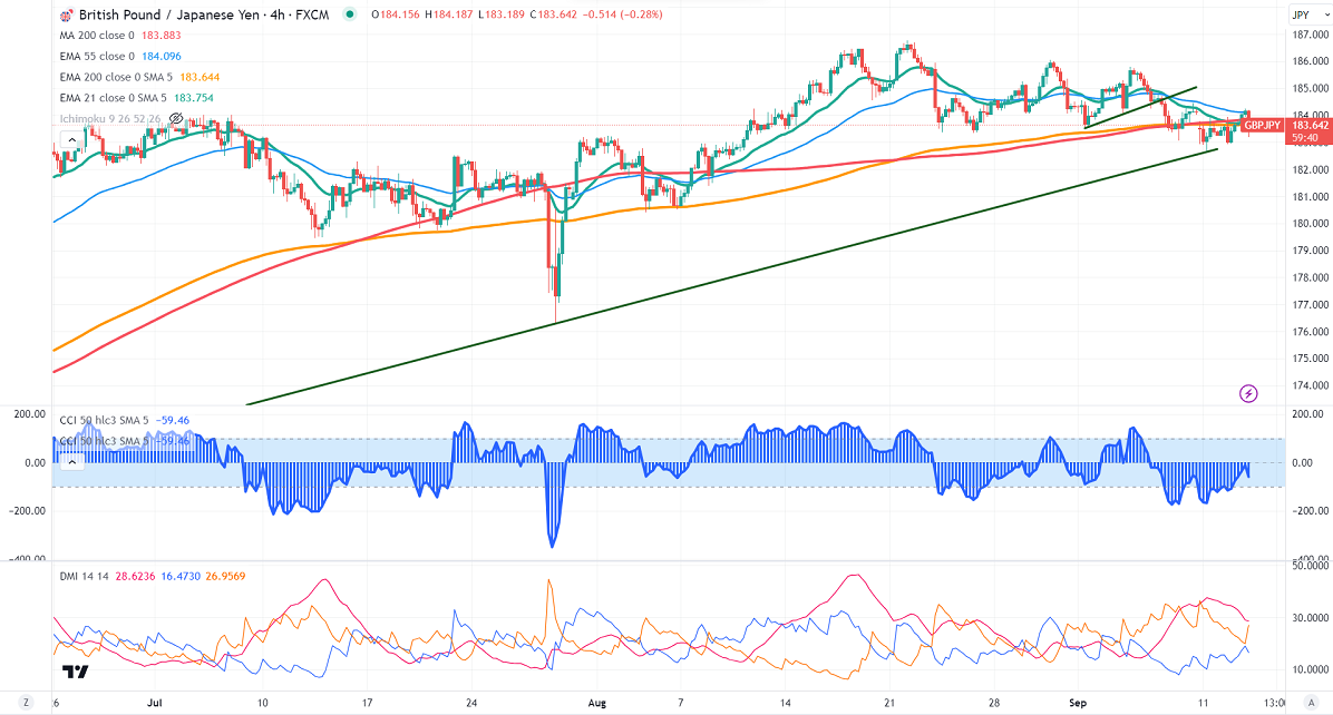 GBPJPY declined sharply on weak Pound sterling. It hit a low of 183.18 at the time of writing and is currently trading around 183.60.
