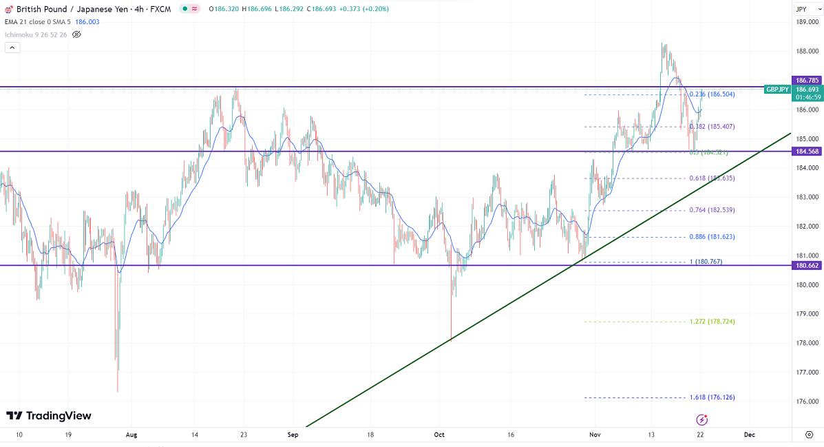 GBPJPY showed a minor pullback after a major sell-off. It hit a low of 184.45 yesterday and is currently trading at around 186.42.