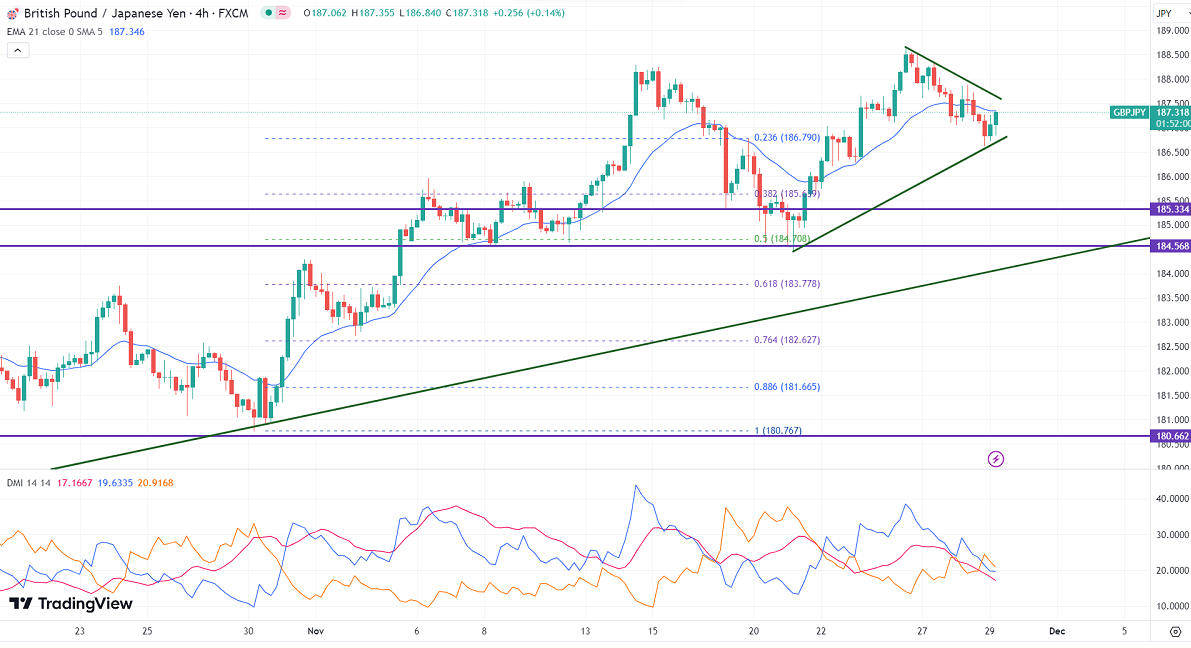 The near-term resistance is around 188.65, a breach above targets 189.20/190. The immediate support is at 186.60, any violation below will drag the pair to 185.40/184.50.
