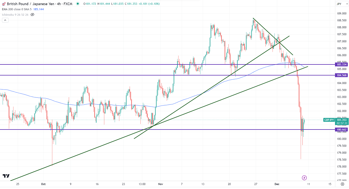 GBPJPY showed a massive sell-off of more than 700 pips on the strong yen. It hit a low of 178.53 yesterday. It is currently trading at around 181.17.