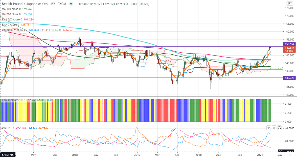 GBPJPY is consolidating between 150.73 and 147.40 for the past two weeks. The slight weakness in the yen is supporting the pair at lower levels. The major sell-off in pound sterling despite the removal of lockdown and declining deaths due to coronavirus. The broad-based US dollar buying is dragging the GBPUSD down below 1.3850 levels. USDJPY is holding above 108 levels, a jump to 108.80 likely. The yen is inversely related to US bond yield. The short-term trend of GBPJPY is bullish as long as support 147.28 holds.