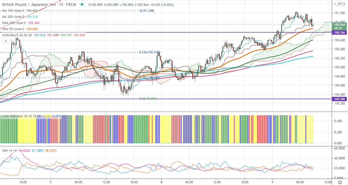 The pair is trading well above 150 levels, any close above 151.20 confirms further bullishness. A jump to 152.70/154 is possible. On the lower side, near-term support is around 150.30. An indicative break below will drag the pair down to 150/149.76/149.40. Significant trend reversal only below 147.40.