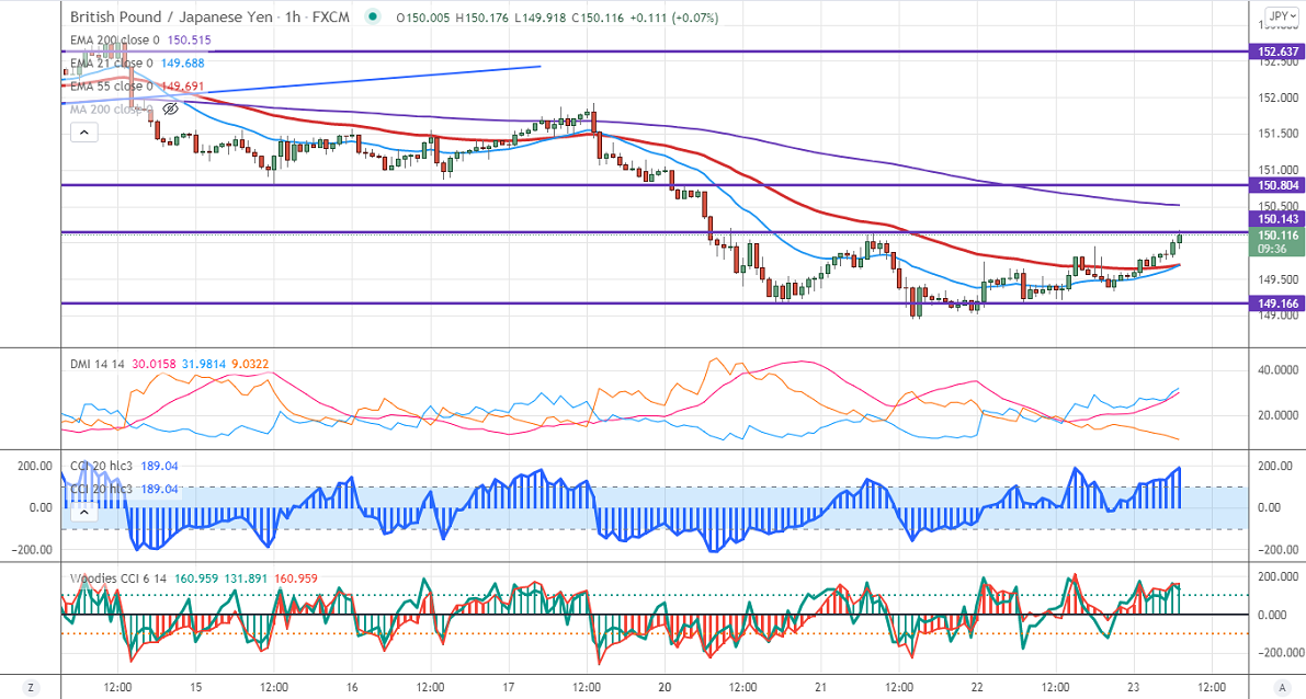 GBPJPY has recovered more than 100 pips on board-based Japanese yen weakness. The pair has broken significant resistance 150.13 made on Sep 21st, 2021, and holding above 150 level. It hits an intraday high of 150.175 and is currently trading around 150.163. The intraday trend of GBPJPY is bullish as long as support 149.69 holds.