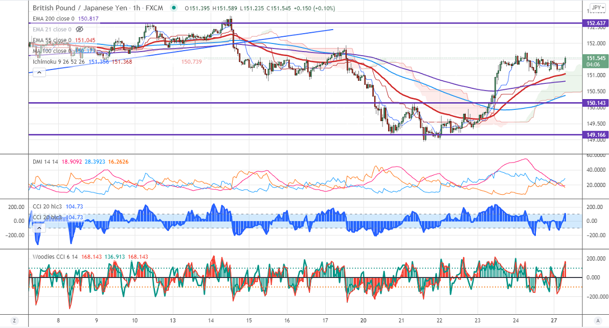 The pair's immediate resistance is around 151.75, any surge above targets 152/153/153.50. Significant bullish continuation if it breaks 153.50. On the lower side, near-term support is around 150.65. Any indicative violation below targets 150/149/148.40/148/147.40.